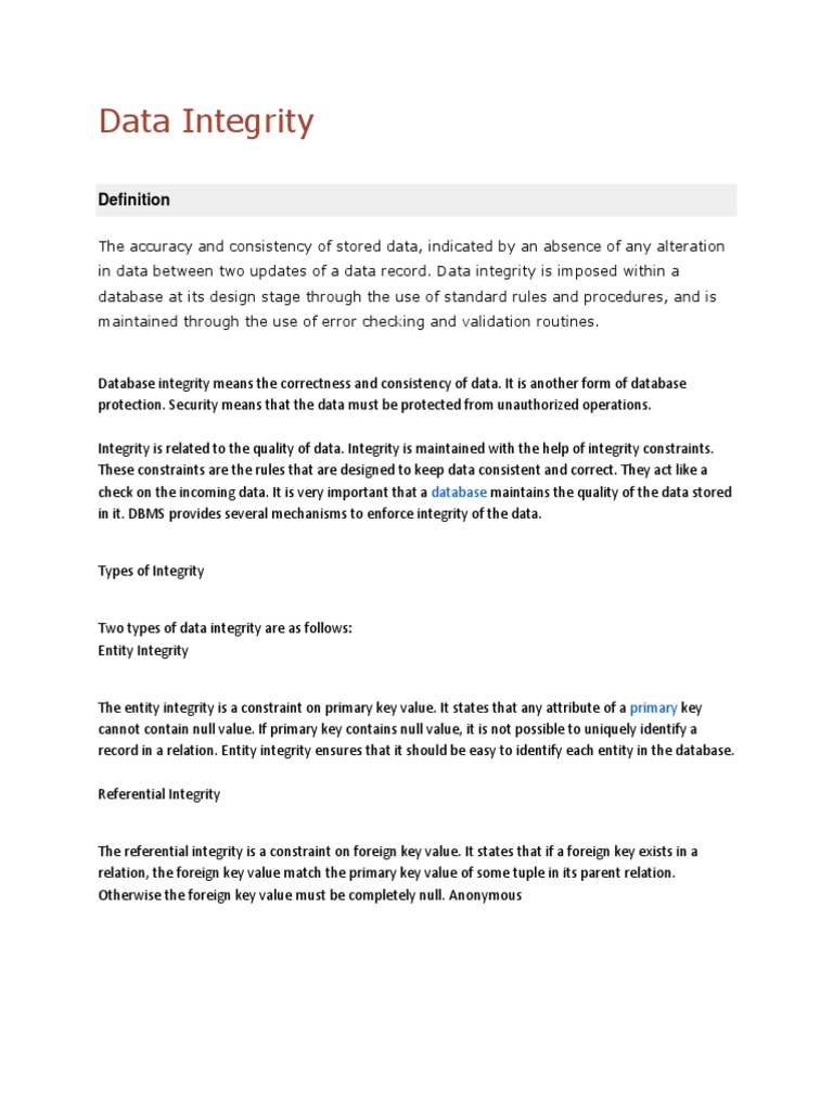 Definition of referential integrity in dbms. Example for example if we delete record number 15 in a primary table we need to be sure that there s no foreign key in any related table with the value of 15. We don t want to have a situation where a foreign key value has no matching primary key value in the primary table. Cascade referential integrity in sql server example in this example we will add a foreign key constraint with cascade referential integrity in sql server. This definition explains the meaning of data integrity and why it matters.